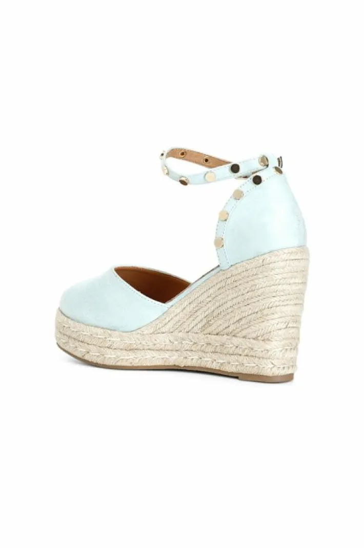 Sandali su zeppa in corda con cinturino alla caviglia in tessuto chiuso davanti e dietro con borchie dorate.
