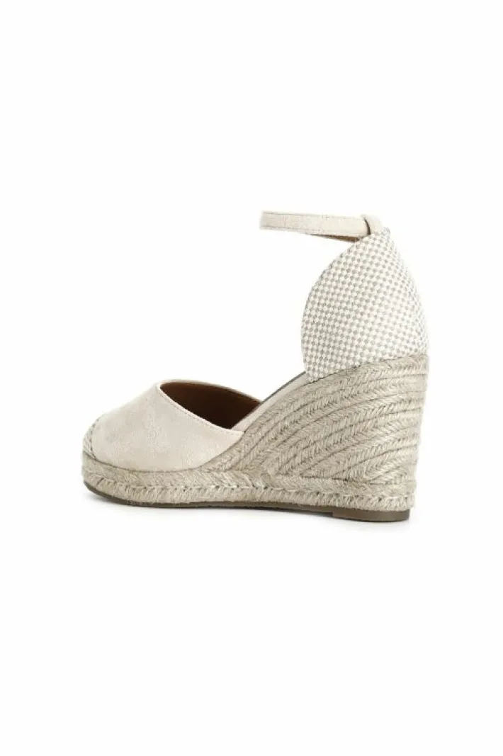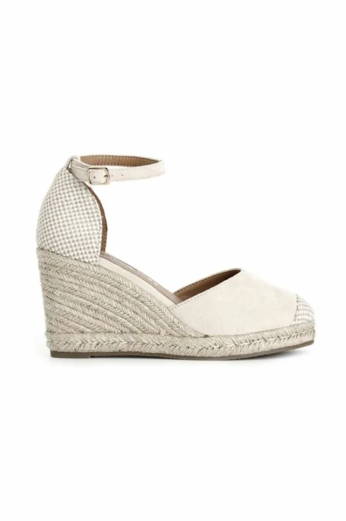 Sandali in tessuto su zeppa in corda. cinturino alla caviglia in tessuto. calzatura chiusa davanti e dietro.