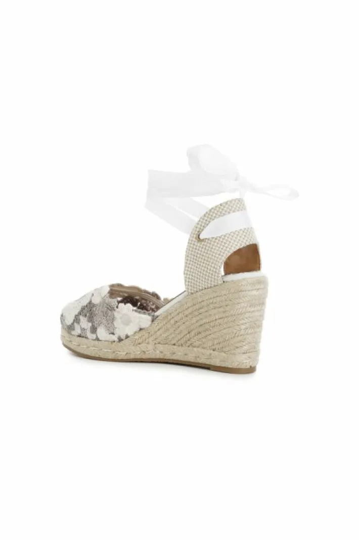 Sandali con zeppa e plateux in corda realizzata in tessuto ricamato e laccio alla schiava.