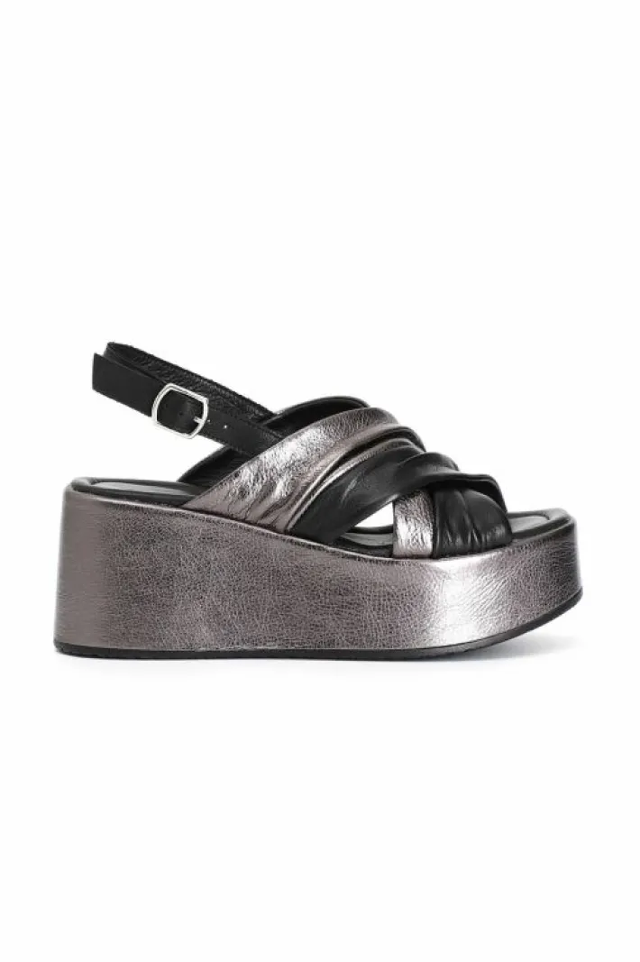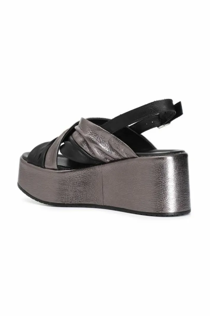 Sandali incrocio bicolor su zeppa fasciata in pelle.