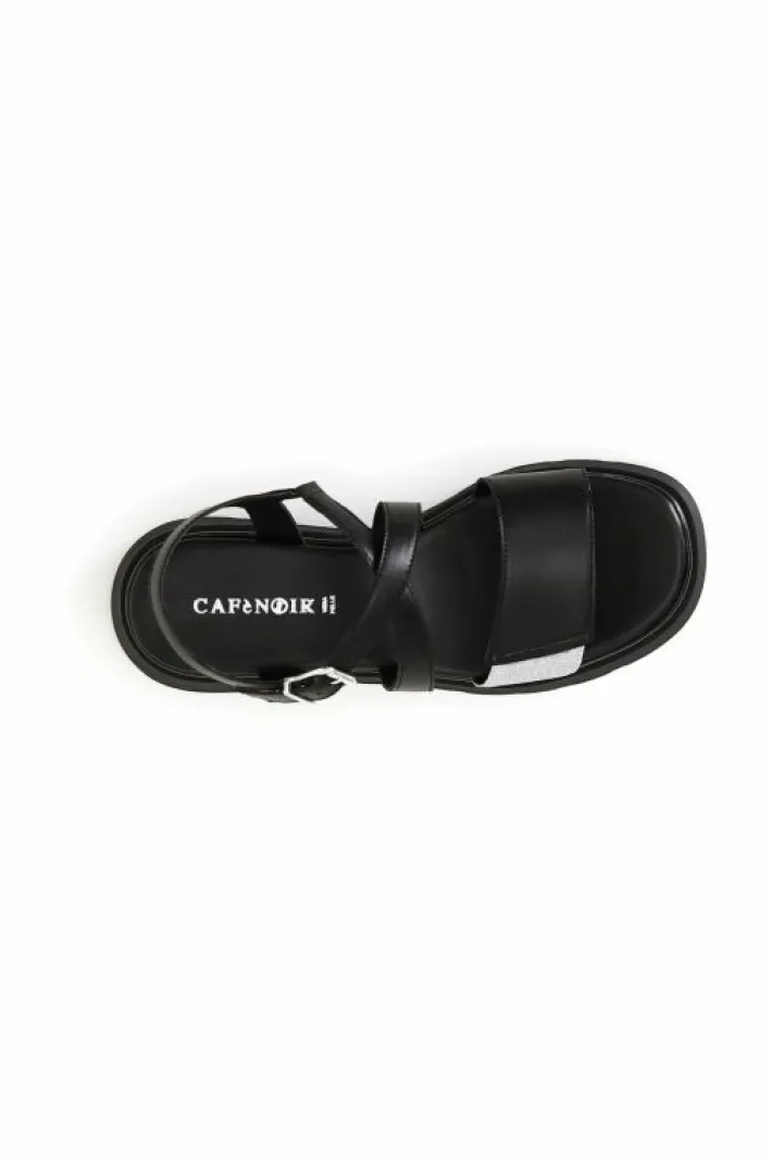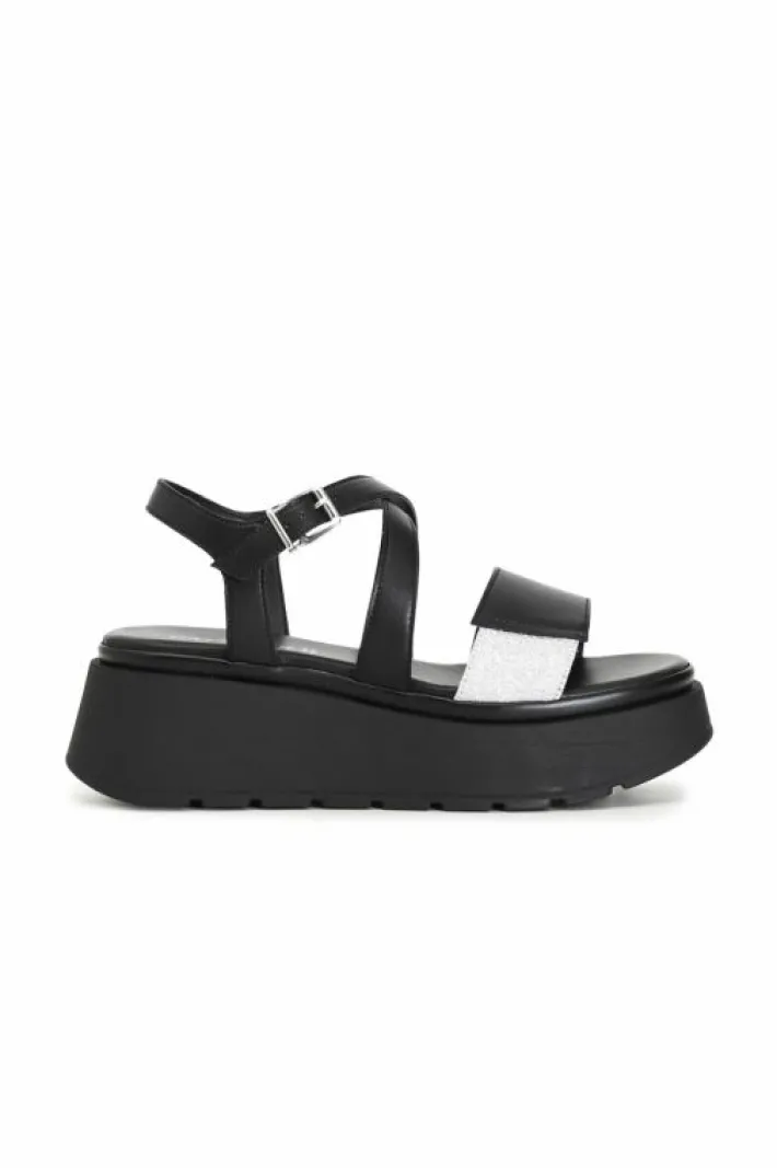 Sandali incrocio bicolor in pelle e glitter su zeppa.