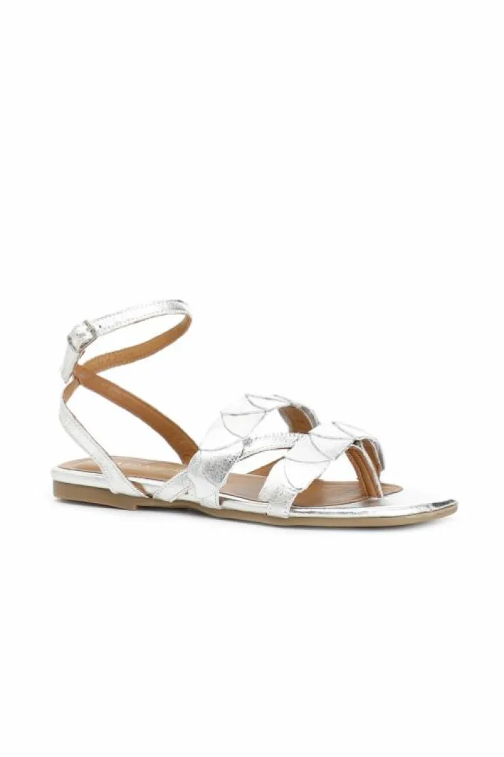 Sandali bassi in pelle con doppia fascia modello gilda e cinturino alla caviglia. decoro bicolor frontale simile ad un intreccio di foglie.