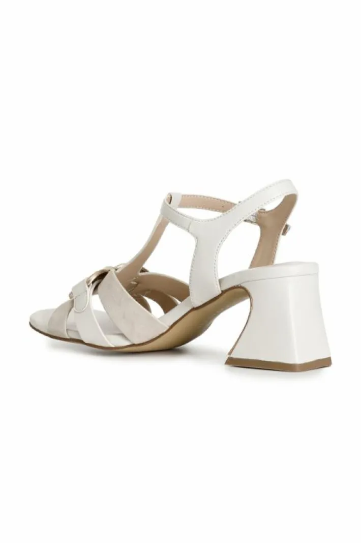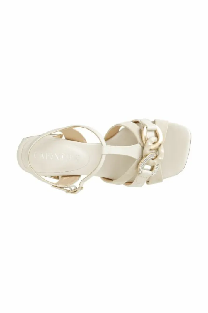 Sandali modello a “t” in camoscio e nappa con accessorio catena. calzatura che può essere indossata tutto il giorno grazie al tacco a base larga alto 55mm e alla comoda base d’appoggio.