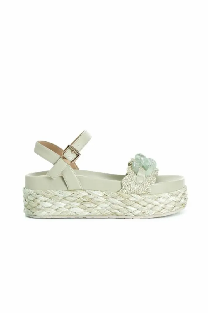 Sandali color block in raffia intrecciata con accessorio catena trasparente satinata. comodo footbed e la zeppa è fasciata in raffia.