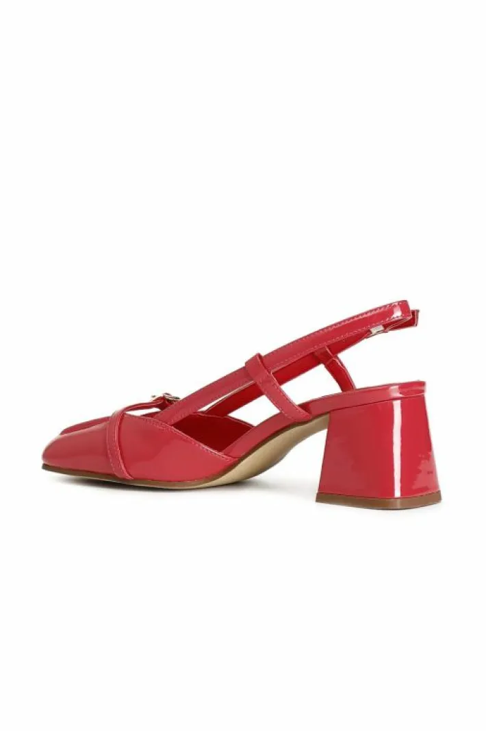 Scarpe aperte in vernice con bordo effetto mocassino e fibbia gioiello. calzatura dalla forma arrotondata. un mix tra un mocassino e una décolleté. laccio sul dietro. tacco alto 45mm. molto comoda perfetta per l’uso quotidiano.