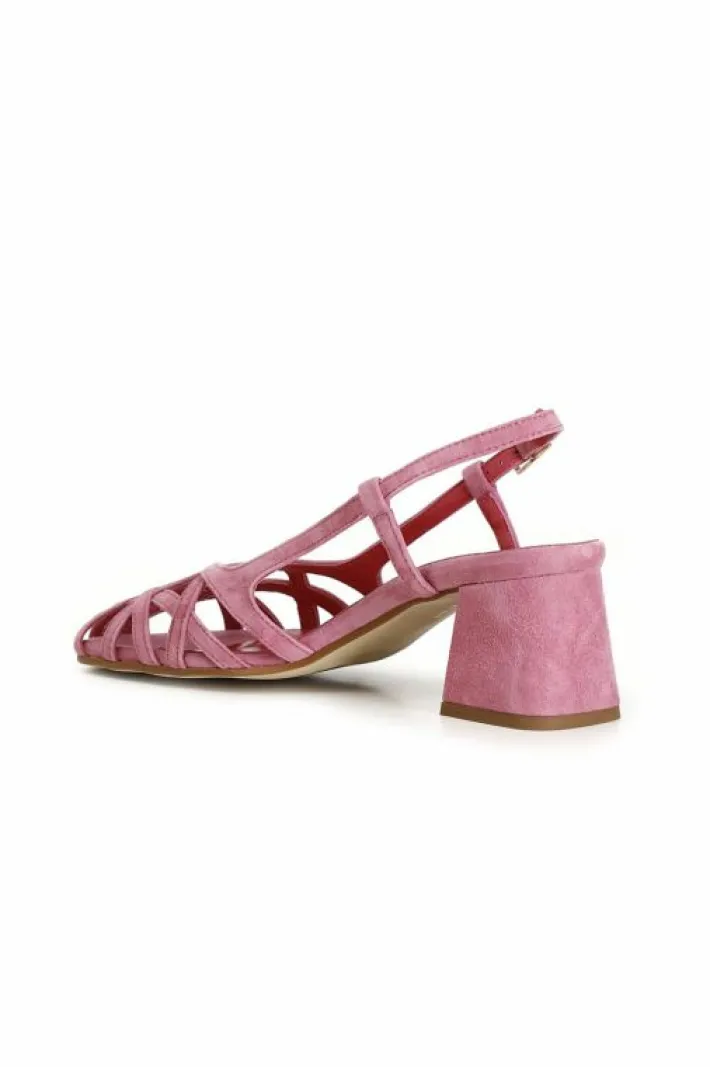 Scarpe in suede realizzate in camoscio con gabbia asimmetrica intrecciata. tacco da 5 cm fasciato con lo stesso pellame