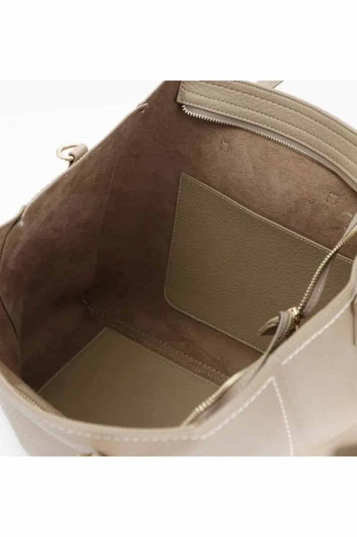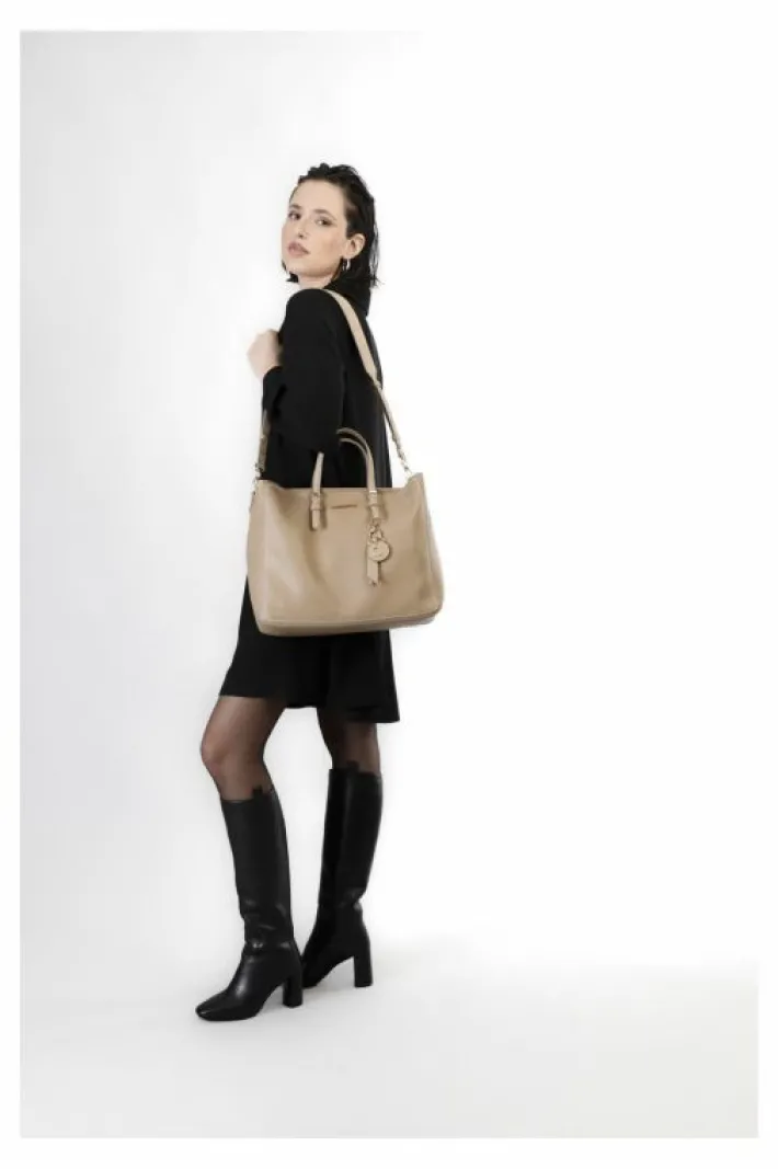 Shopping dalla struttura morbida sfoderata con charms e tracolla removibile logata con rivetti. unico scomparto e taschino interno di 200 mm aperto. chiusura con cerniera.