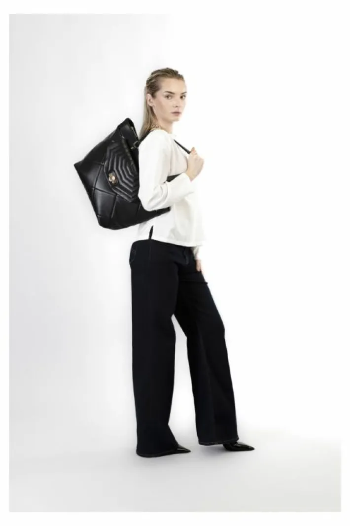Shopping trapuntata con motivo a rombi. tasca frontale con pattina trapuntata con motivo a righe e chiusura in metallo personalizzata. chiusura con cerniera