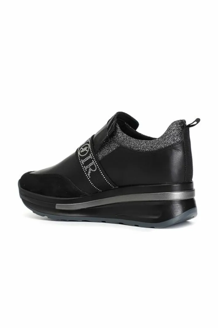 Slip-on da donna in pelle arricchita da dettagli glitterati e graziosa fascia con logo cafènoir in strass. suola rialza…