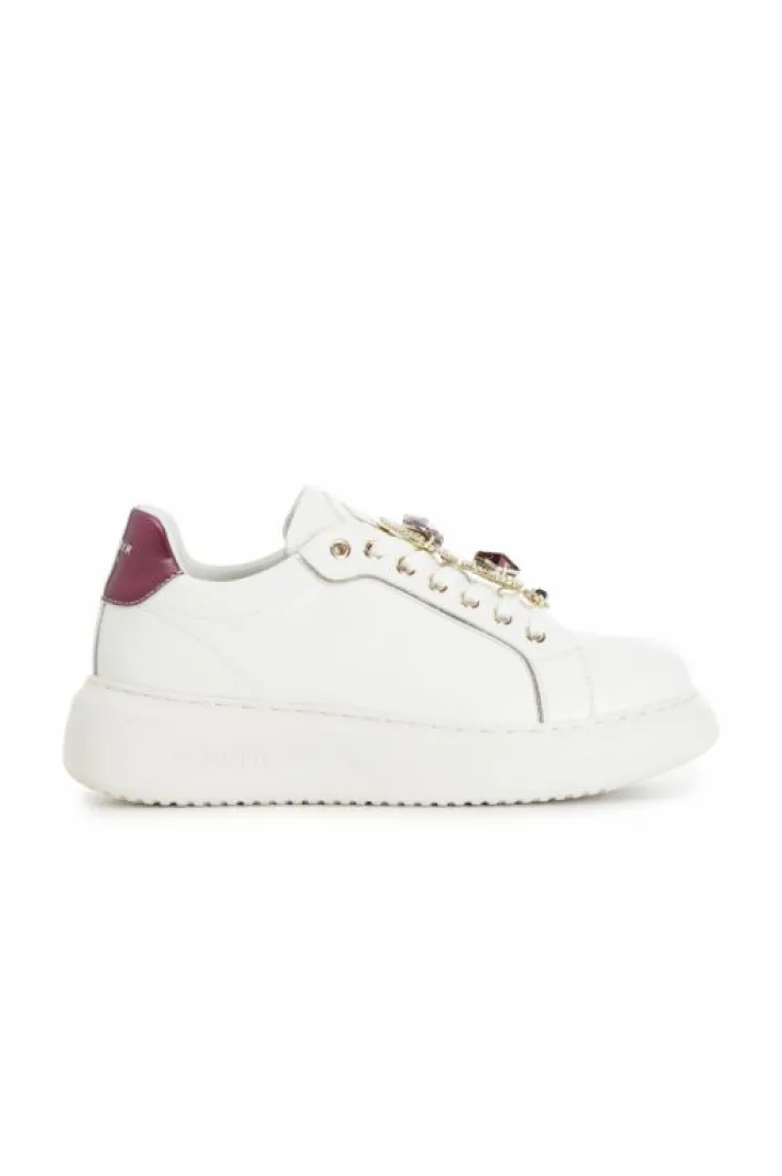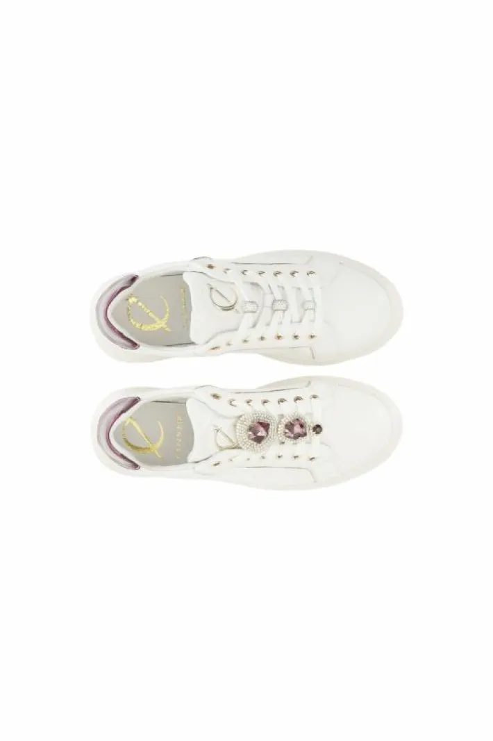 Sneakers da donna allacciate realizzate in morbida pelle. calzatura decorata con accessori gioiello removibili diversa tra destra e sinistra. tallone con dettagli in laminato. tomaia e sottopiede in pelle. fussbett interno. punta tonda. altezza suola 40mm.