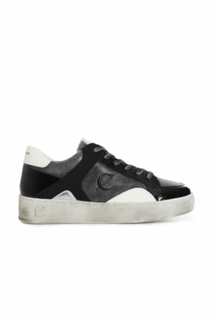 Sneakers da donna in pelle e pelle scamosciata con riporti effetto vernice e metallico. logo embossed laterale con monoframma cafènoir. calzatura dalla forma stondata. chiusura con lacci. fussbett interno. suola a cassetta 30mm.