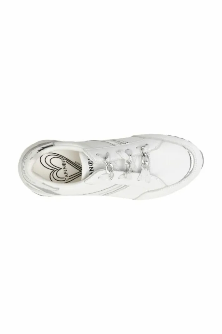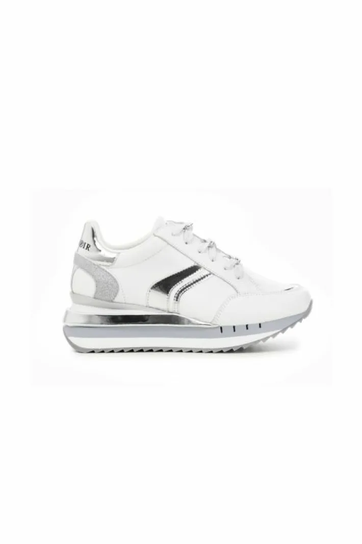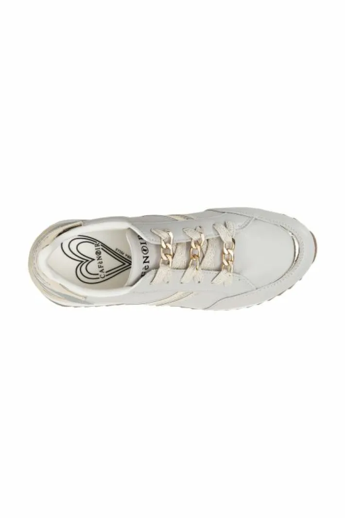 Sneakers in pelle con riporti laminati effetto specchio. Una delicata catena funge da passalaccio e decora l’allacciatura.