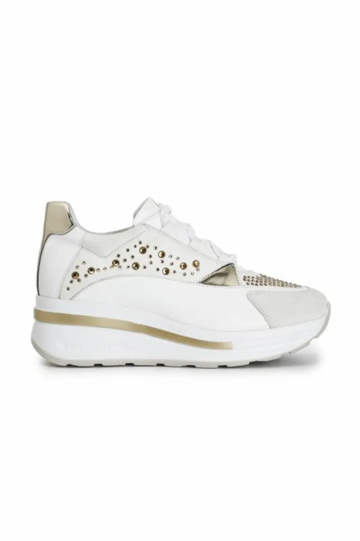 Sneakers in pelle e fantasia di strass termosaldati sul davanti e con motivo laterale. suola con zeppa bicolor di 40mm con logo embossed.