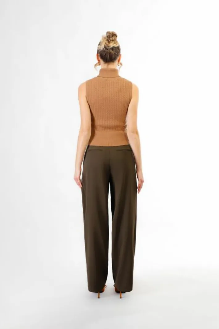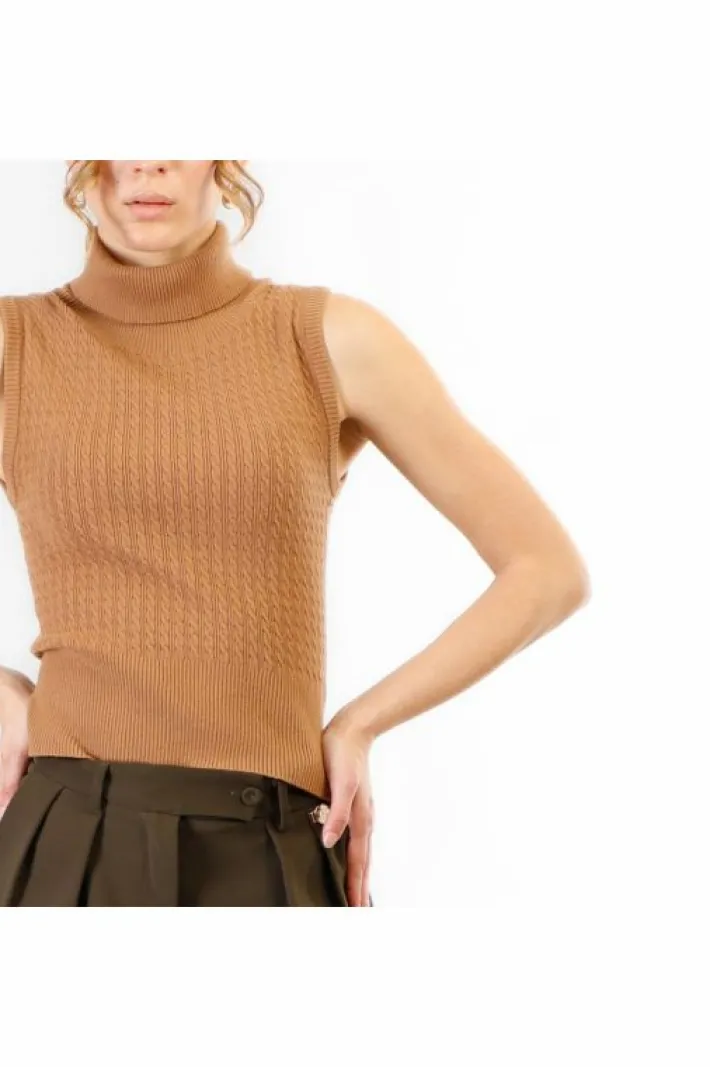 Maglia sottogiacca smanicata con collo alto con lavorazione di rib e treccia realizzata in filato misto viscosa. perfetta per essere indossata con qualunque abbinamento.