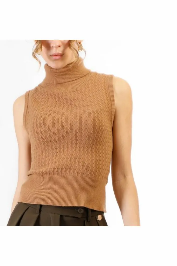 Maglia sottogiacca smanicata con collo alto con lavorazione di rib e treccia realizzata in filato misto viscosa. perfett…