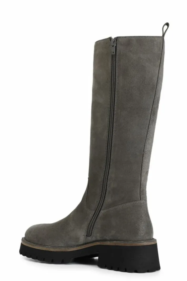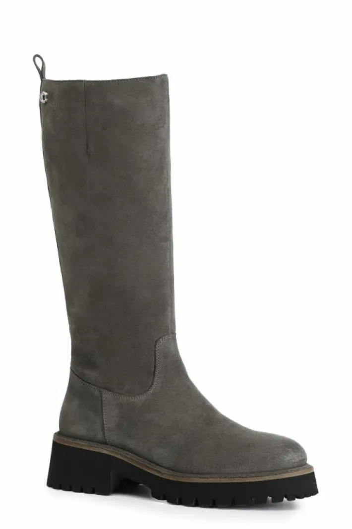 Stivale da donna in pelle scamosciata e tacco 50mm e borchietta personalizzata. il soletto è in pelle.