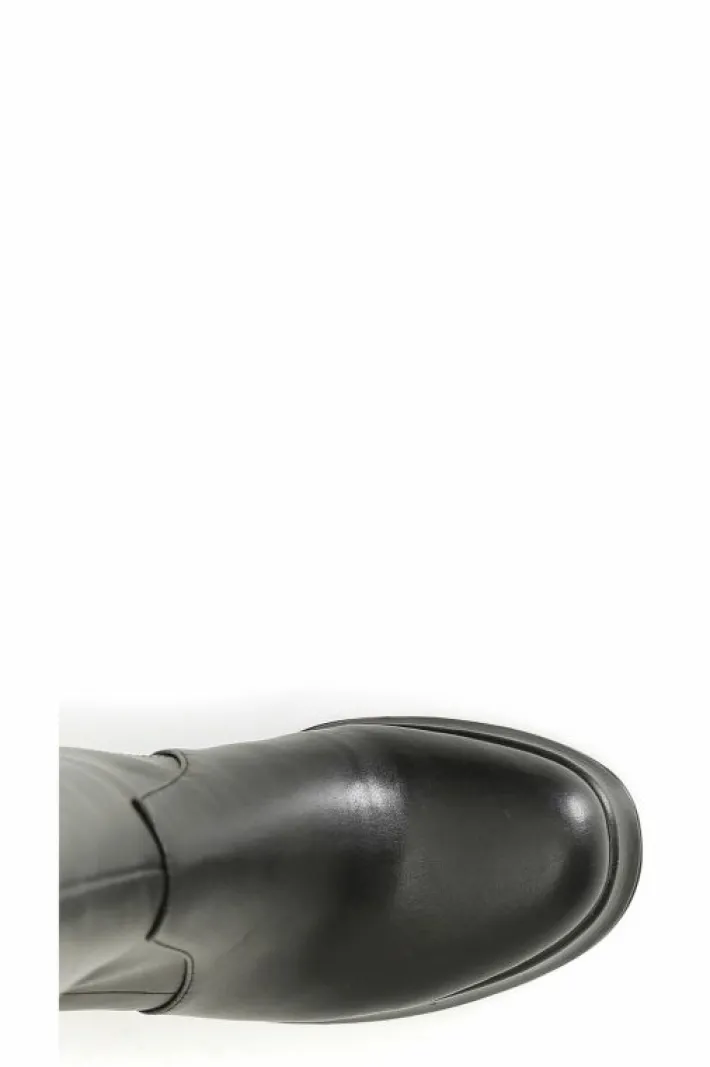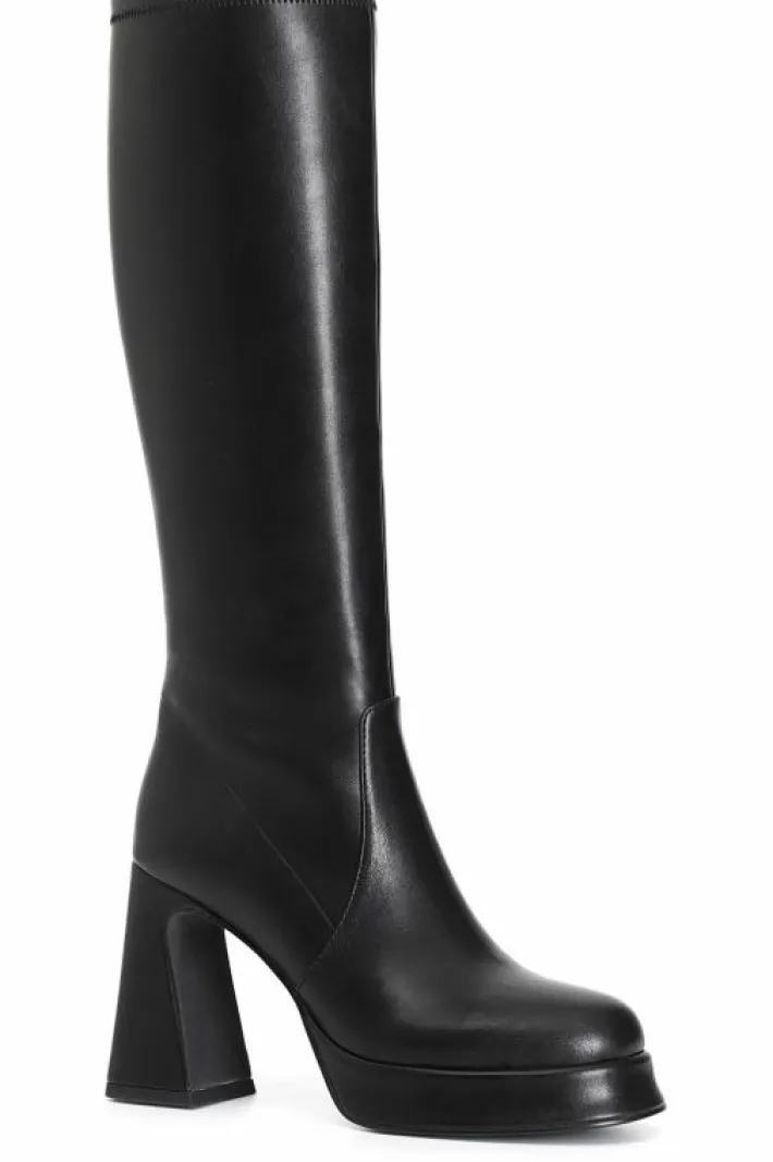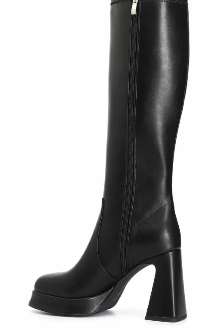 Stivale da donna stretch in similpelle. calzatura dal perfetto stile seventies. il tacco altezza 95mm insieme al plateau di 18mm donano equilibrio tra altezza bellezza e comodità.