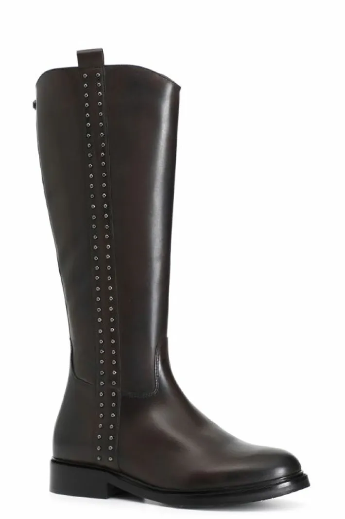 Stivale in pelle con una cascata di borchie laterali che donano allo stesso tempo armonia e dinamicità grazie anche ad gioco di impunture. il soletto è in pelle.
