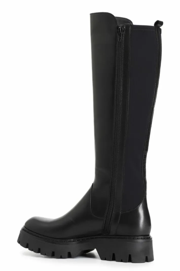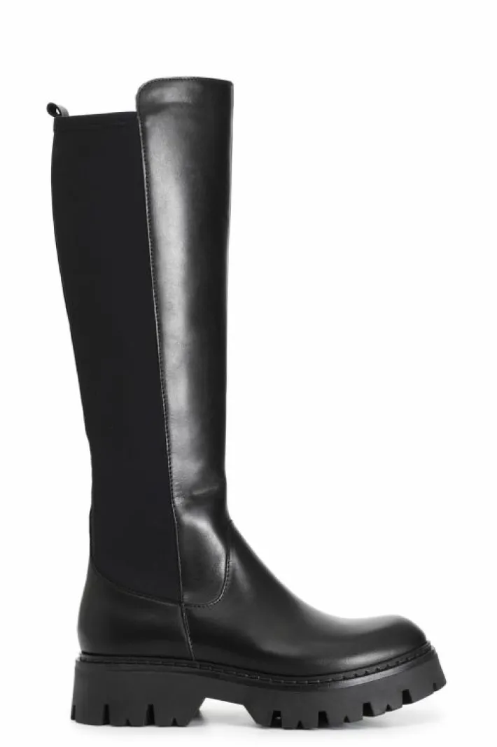 Stivale da donna in pelle e tessuto elasticizzato per un look super grintoso. il soletto è in pelle. modello versatile e dinamico ideale per completare moltissimi outfit.