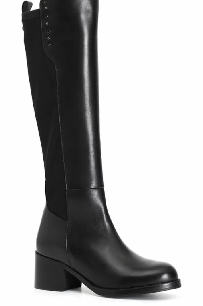 Stivale da donna in pelle e stretch arricchito da borchie. il tacco è alto 50mm e il soletto è in pelle.