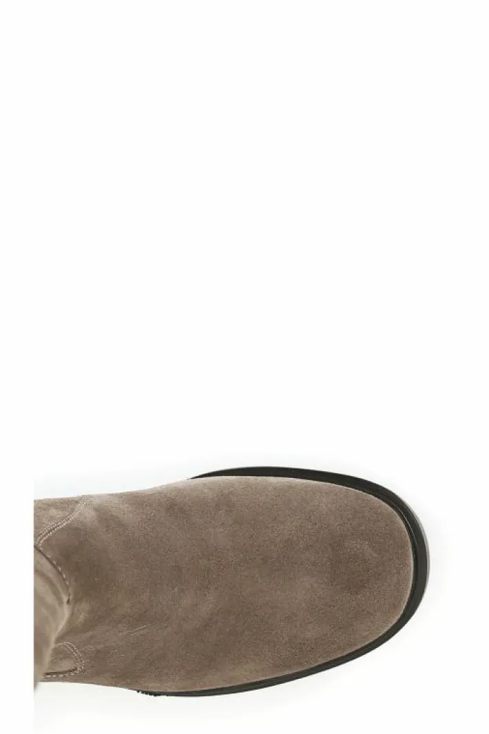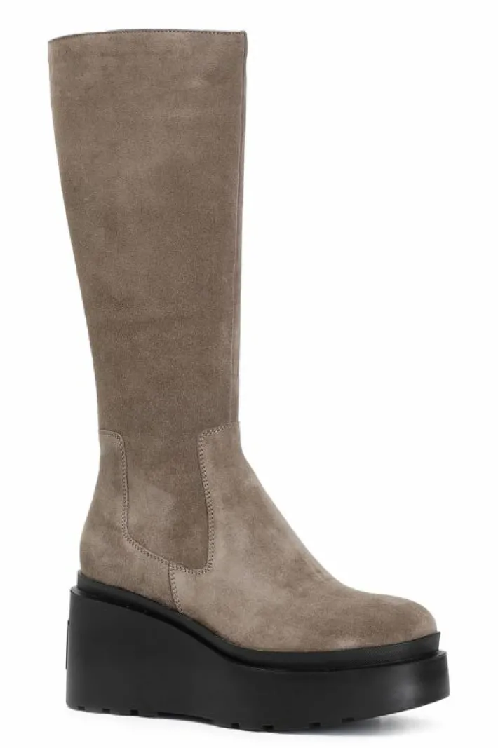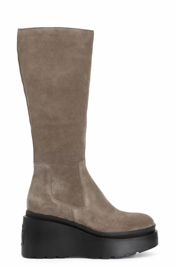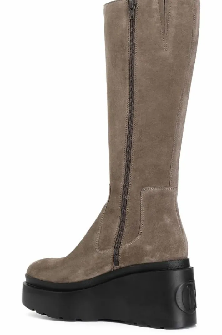Stivale in pelle scamosciata con pleteau e tacco. soletto in pelle e suola con zeppa personalizzata con logo a rilievo sul retro.