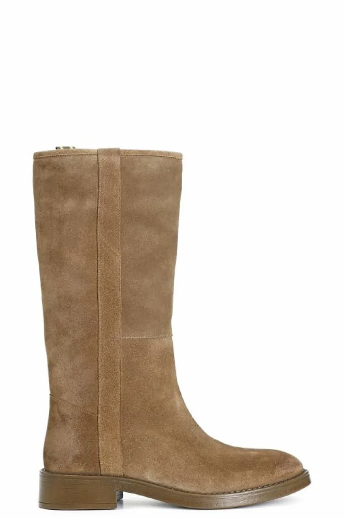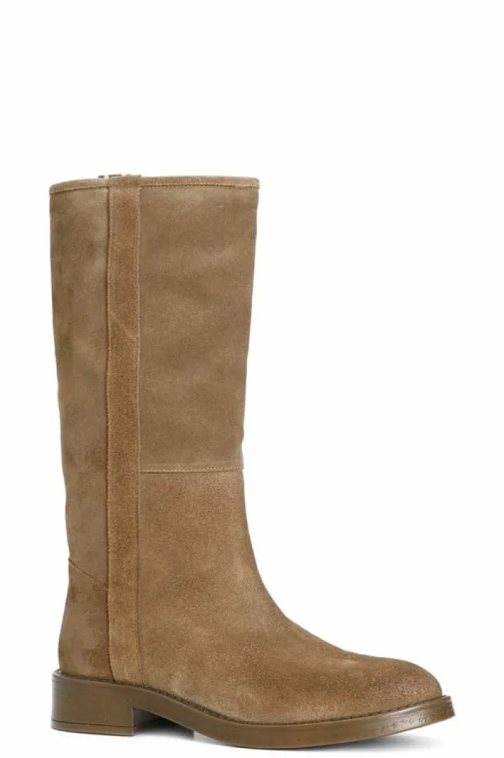 Stivale modello cavaliere in pelle scamosciata dalla forma arrotondata. tacco alto 33 mm. il soletto è in pelle.
