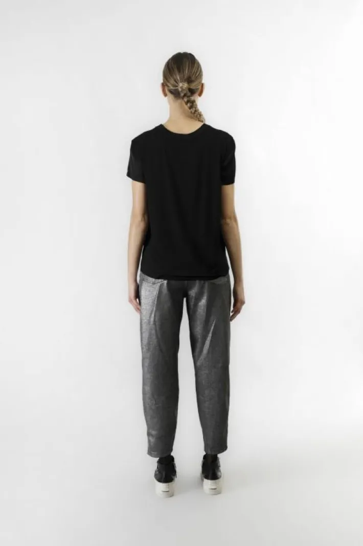 T-shirt bimateriale dalla manica corta . il davanti della t-shirt e le maniche è realizzata in satin di viscosa con stampa del nostro logo con stampa effetto glitter. il dietro è in jersey di viscosa.