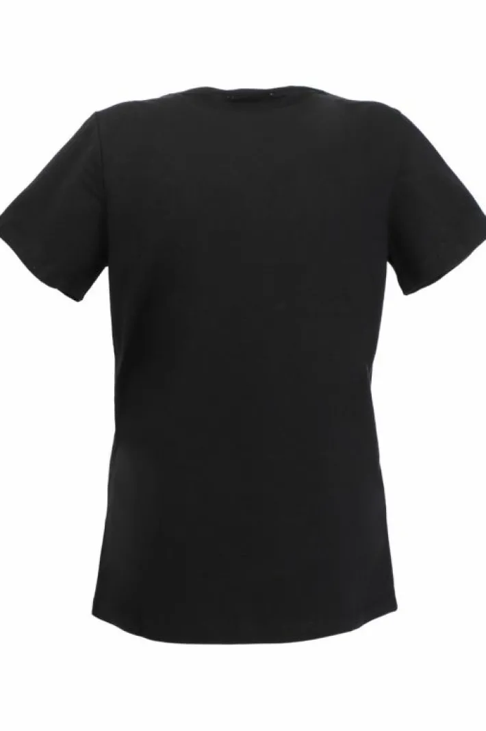 T-shirt a maniche corte in jersey di cotone elasticizzato che riproduce la stampa del simpatico cat noir che fa picafènoiric sul prato. la t-shirt è arricchita da strass.