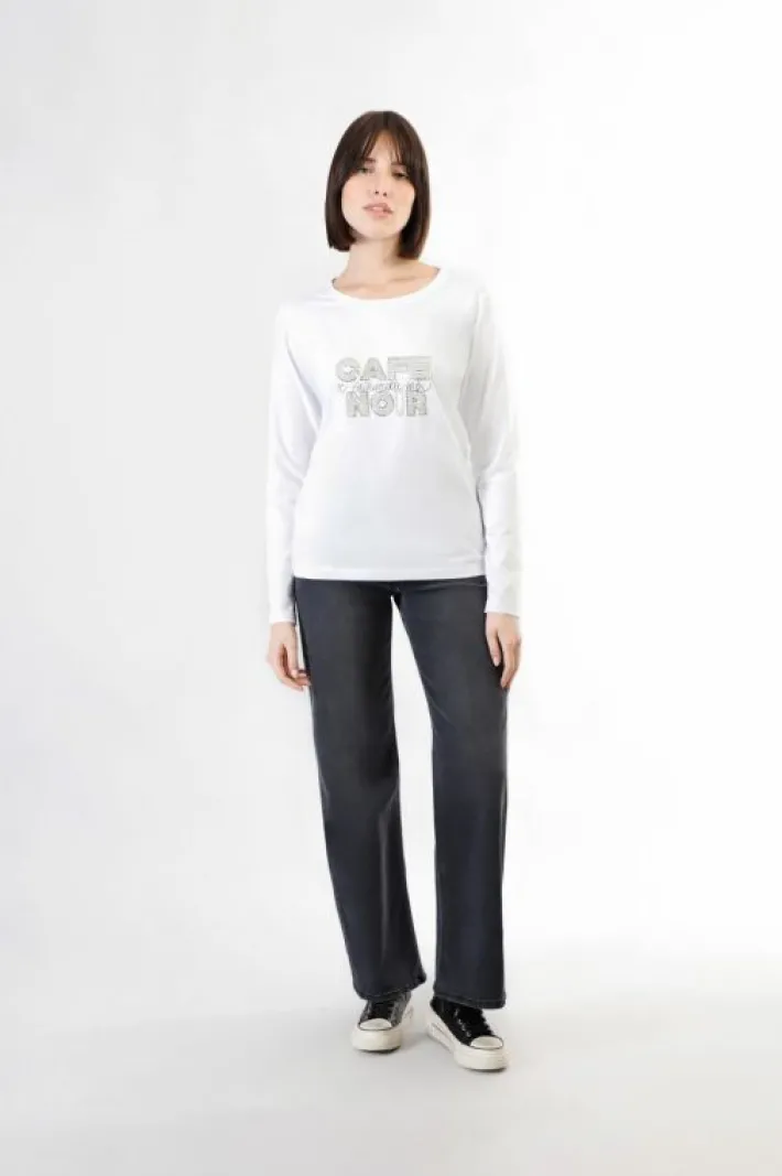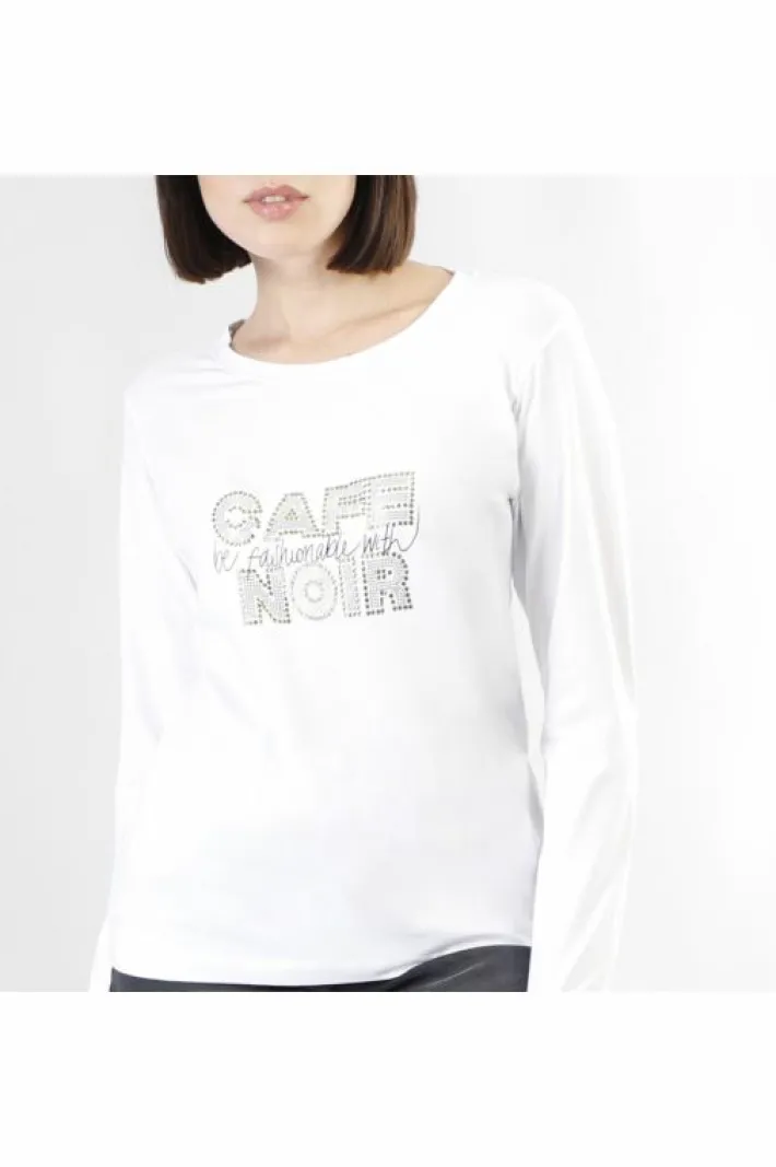 T-shirt a manica lunga e scollatura rotonda realizzata in cotone elasticizzato. logo cafènoir tridimensionale in strass.