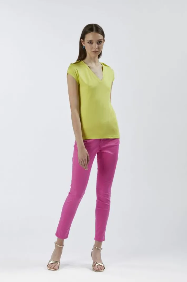 Fresca e leggera questa t-shirt è realizzata in jersey di viscosa. scollatura a “v” e maniche ad aletta. placchette dor…