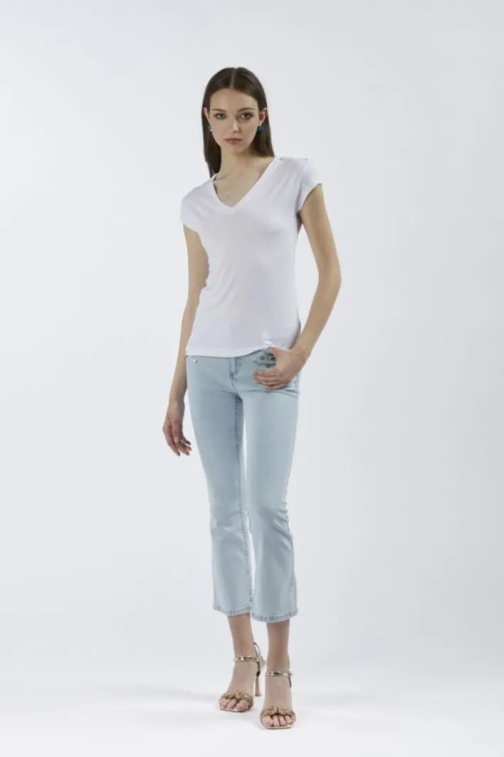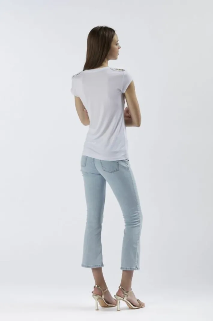 Fresca e leggera questa t-shirt è realizzata in jersey di viscosa. scollatura a “v” e maniche ad aletta. placchette dorate con logo decorano spalle.