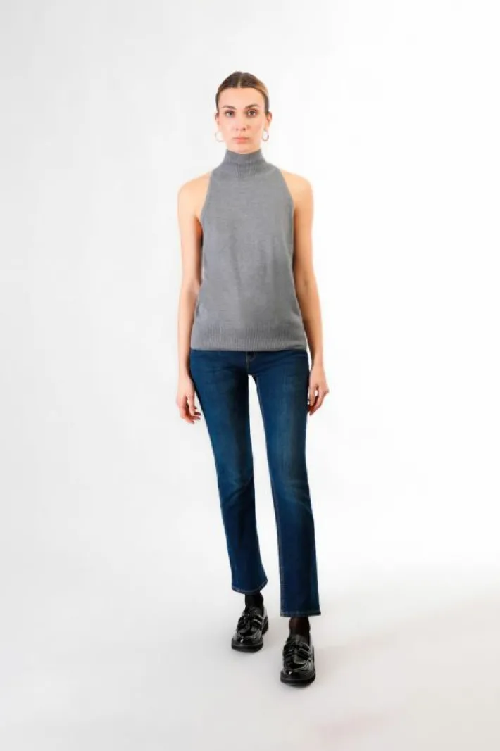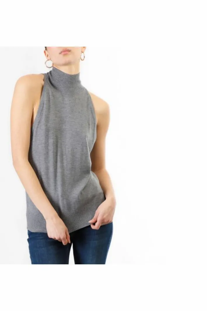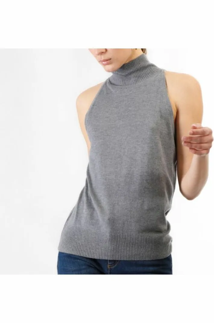 Top smanicato con colletto alto realizzata in filato misto cashmere. perfetto per essere indossato con qualunque abbinamento.