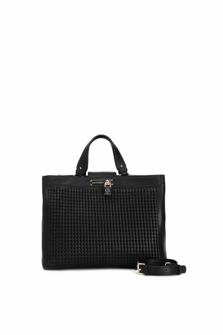 Tote morbida con infilatura e manici. accessorio lucchetto con logo. chiusura magnetica automatica. doppio scomparto. borsa dotata di tracolla.