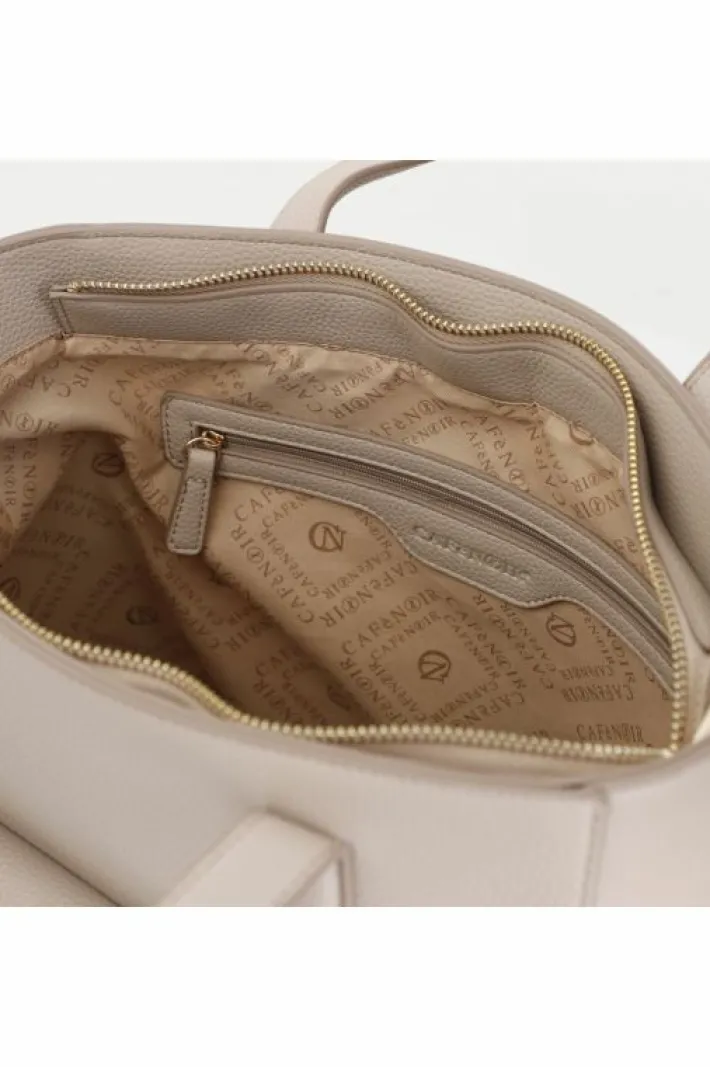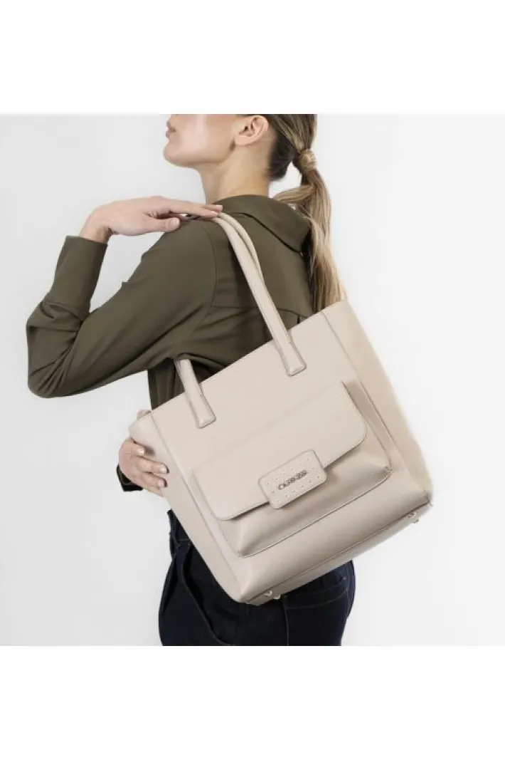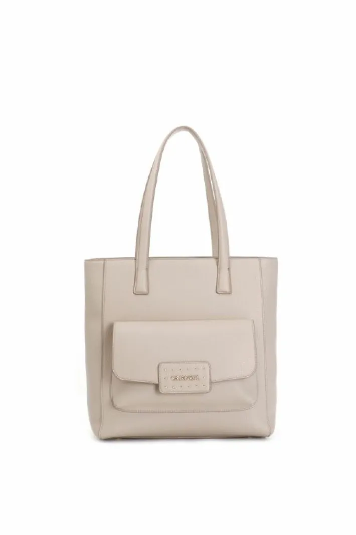 Shopping in materiale sintetico con tasca frontale con applicazione di l logo e rivetti. unico scomparto interno con taschino con cerniera.