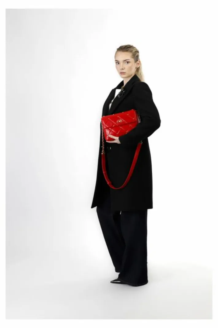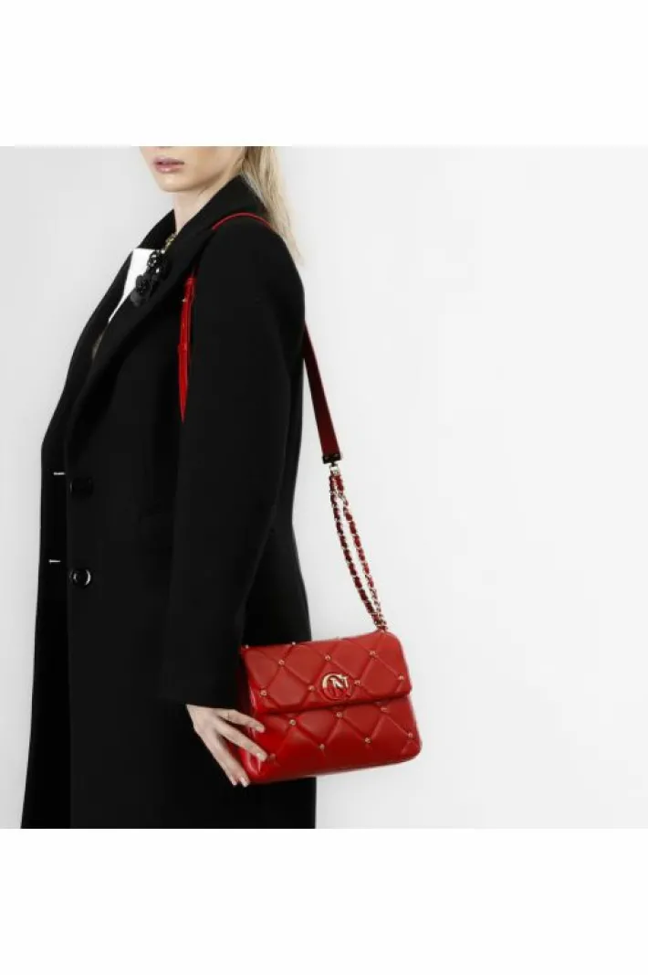 Tracolla con trapunta a rombi con applicazione di rivetti in tono e logo cafènoir bicolore. tracollina regolabile con c…