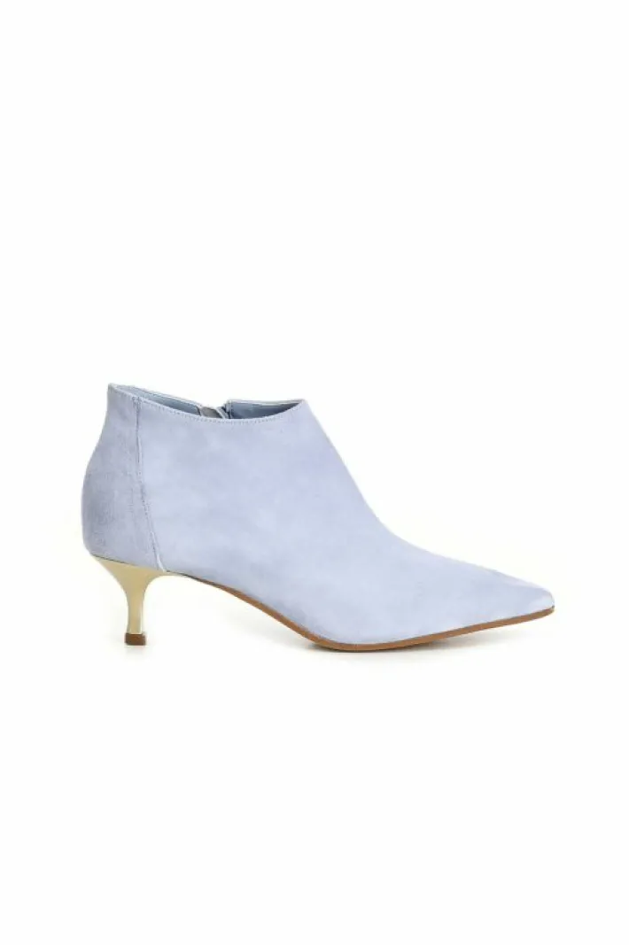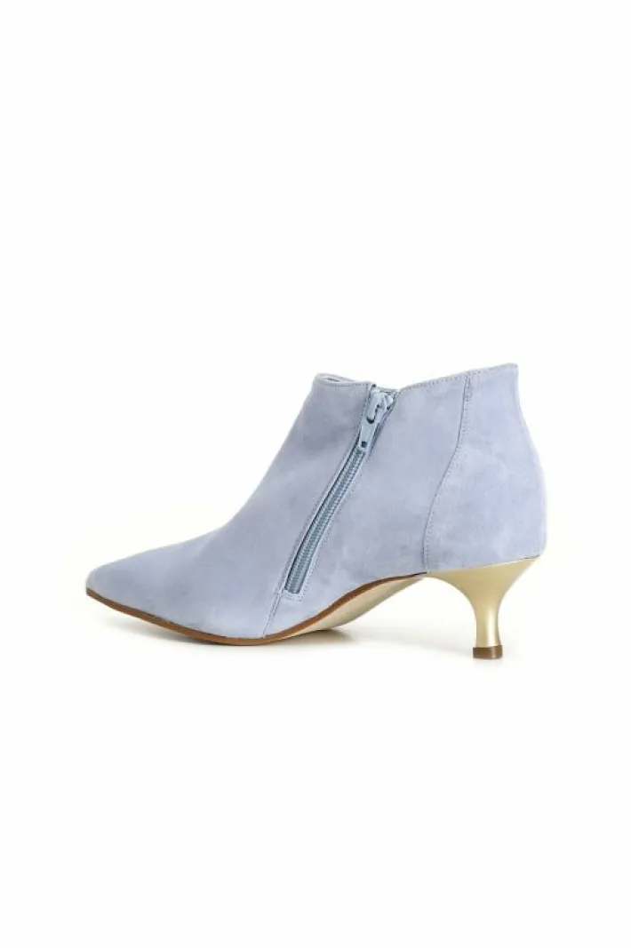 Tronchetti in suede con tacco basso in contrasto colore e zip laterali.