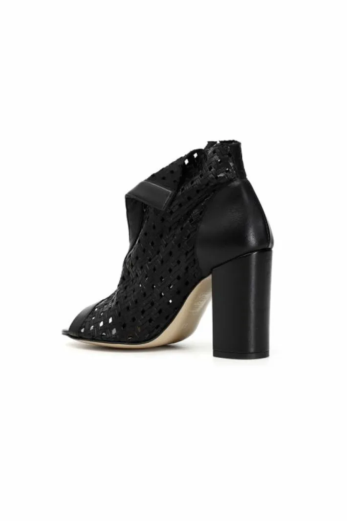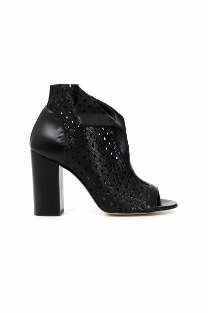 Tronchetti spuntati in pelle traforata, il leggero filo di metallo inserito nell’orlo della tomaia davanti permette una doppia vestibilità permettendo di piegare i lembi in avanti. Logo in metallo in vista o chiuso sulla scollatura a seconda di come si modellano.