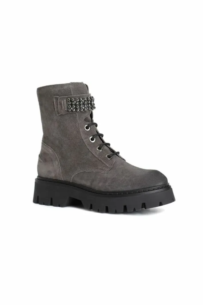 Tronchetto allacciato in pelle scamosciata con accessorio gioiello.cerniera parte interna. il soletto è in pelle. la suola carro armato in materiale extralight slancia la modelleria e la rende iper attuale.