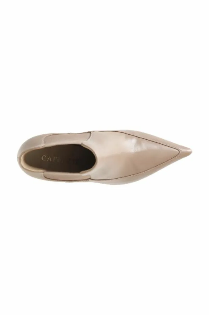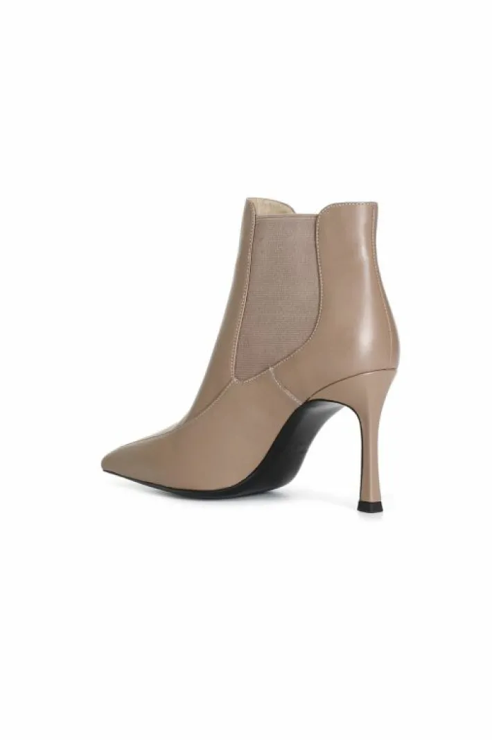 Tronchetto da donna in pelle con elastici laterali per agevolare la calzata. tacco fine alto 87 mm. forma sfilata. fodera e soletto sono in pelle. calzatura dallo stile elegante e femminile.