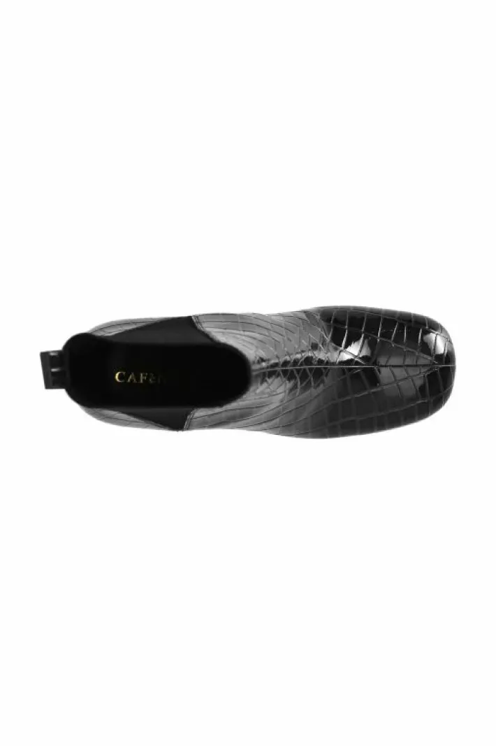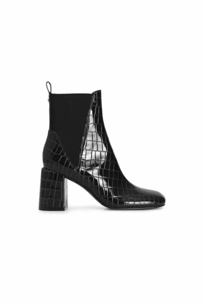 Tronchetto da donna con elastici in stampa effetto cocco. tacco fasciato alto 80 mm. il soletto è in pelle. ideale in abbinamento a molteplici look da mattina a sera.