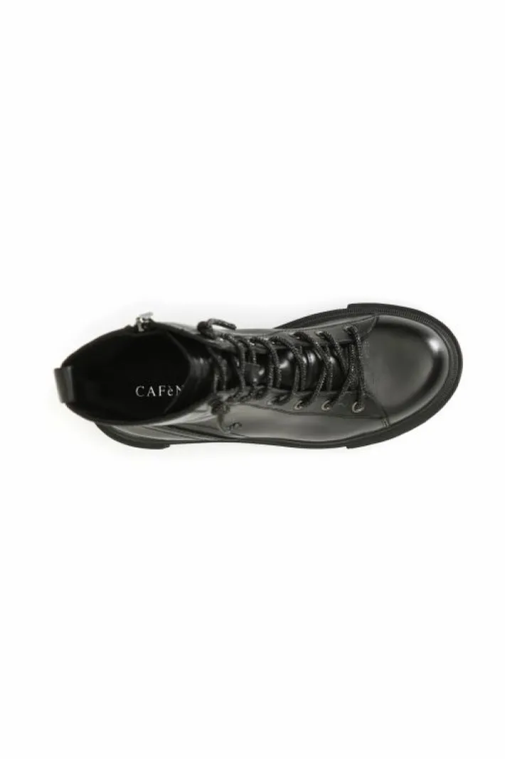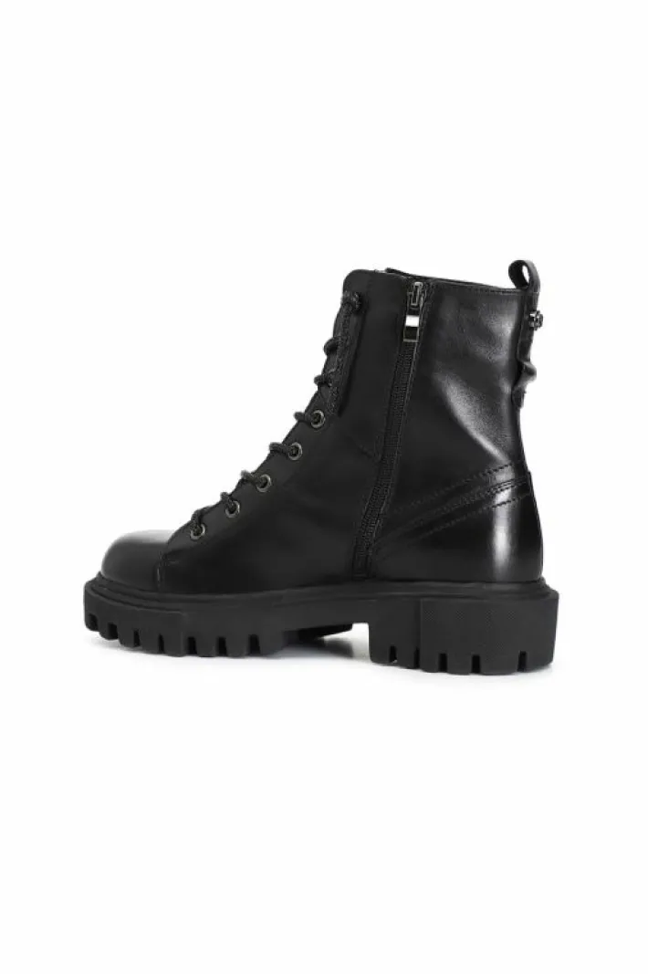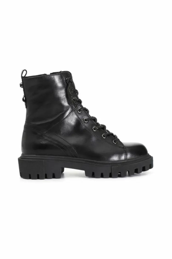 Tronchetto da donna in pelle con lacci fatti impreziositi da strass ultrabrillanti. il soletto è in pelle. la suola carro armato in materiale extralight slancia la modelleria e la rende iper attuale.