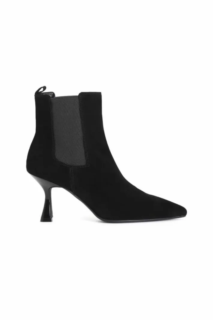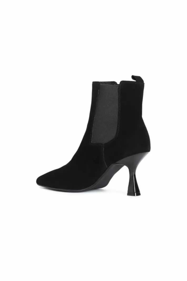 Tronchetto donna in pelle scamosciata con tacco alto 70 mm dalla forma sfilata. elastici laterali per agevolare la calzata. il soletto è in pelle.