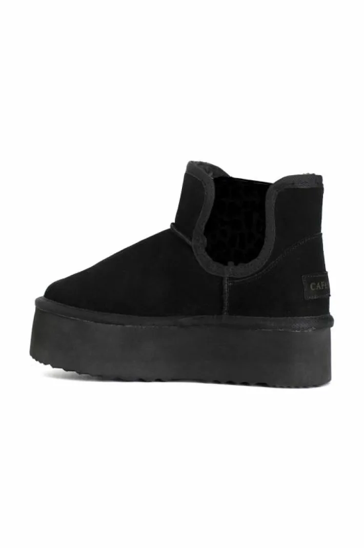 Tronchetto in pelle scamosciata e con elastici stampa maculata. interno in pelliccia sintetica e suola con nuova zeppa alta 35mm.