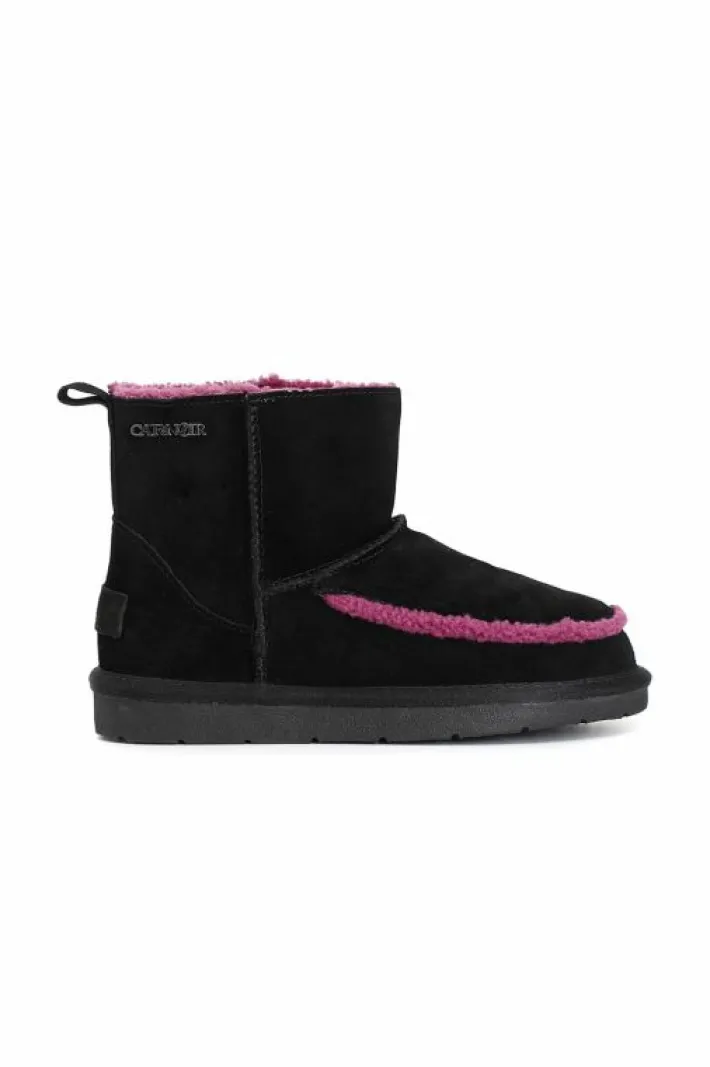 Tronchetto in pelle scamosciata con interno in pelliccia sintetica arricchito da un simpatico inserto a contrasto.