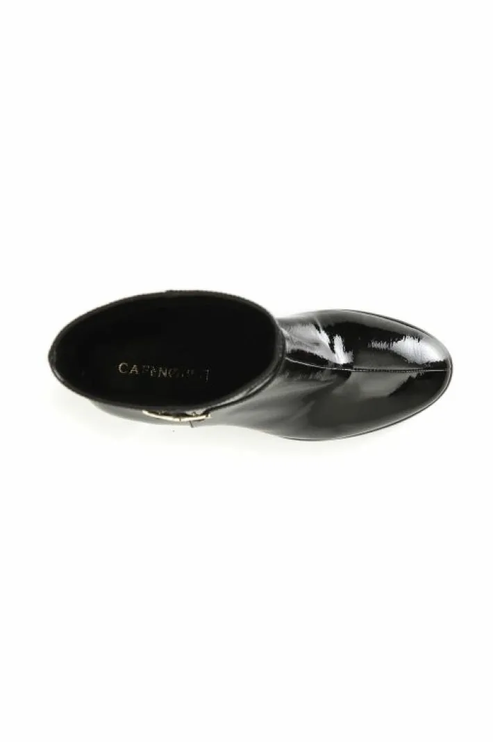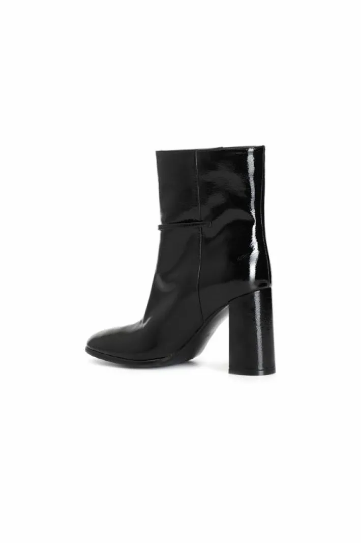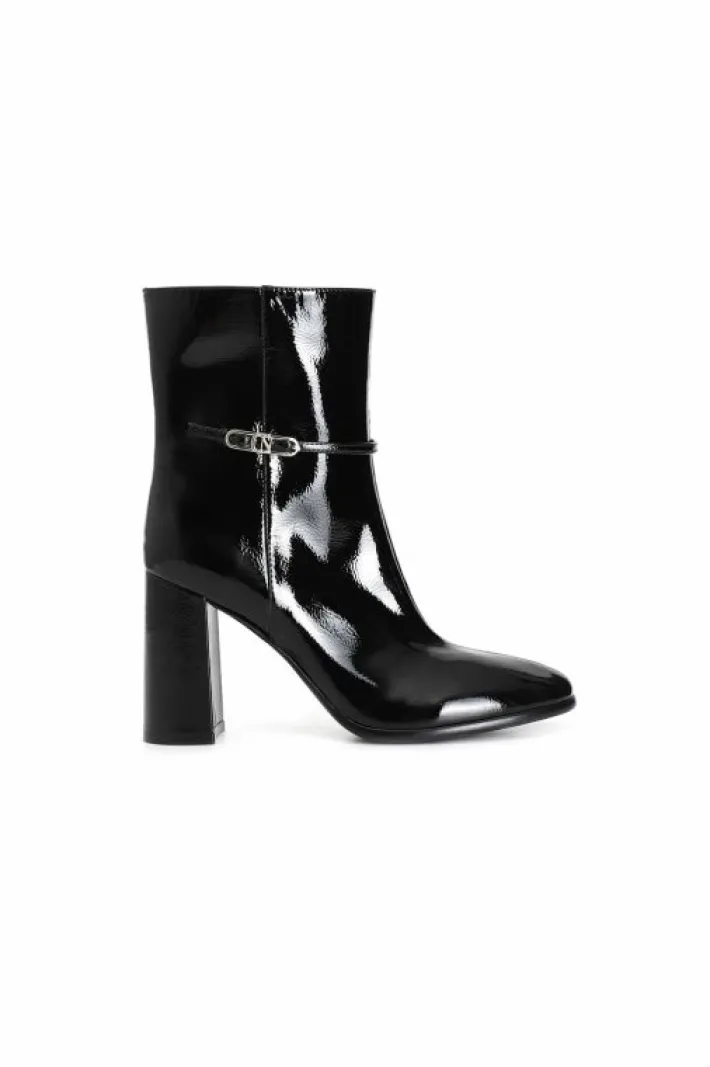 Tronchetto da donna in pelle verniciata con cinturino e accessorio personalizzato. tacco squadrato 88 mm. il soletto è in pelle. calzatura molto versatile e chic per interpretare con stile i look da ufficio e per il tempo libero.