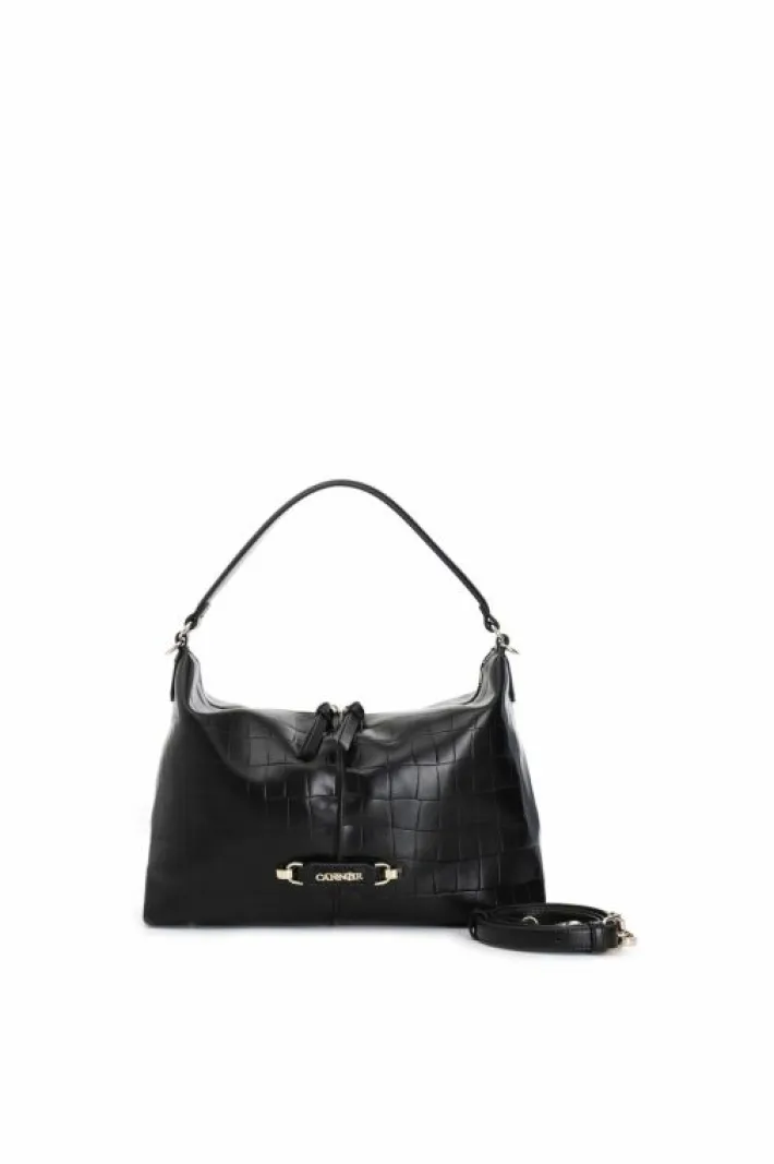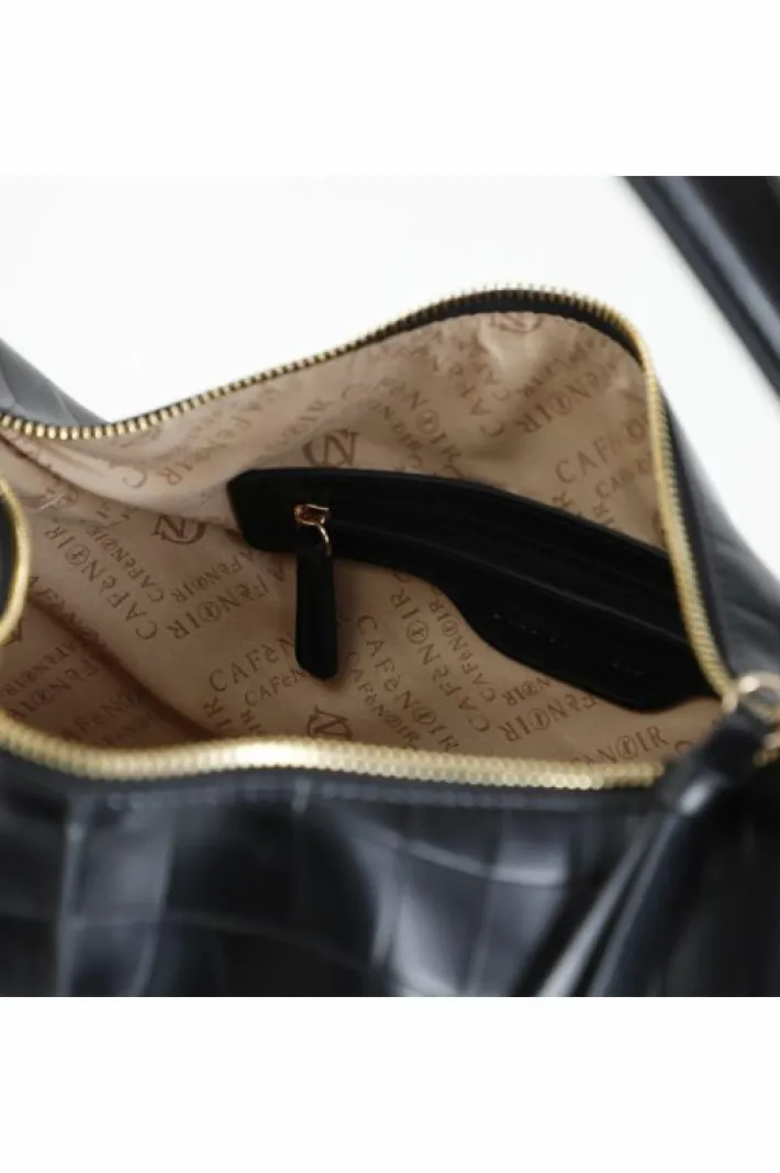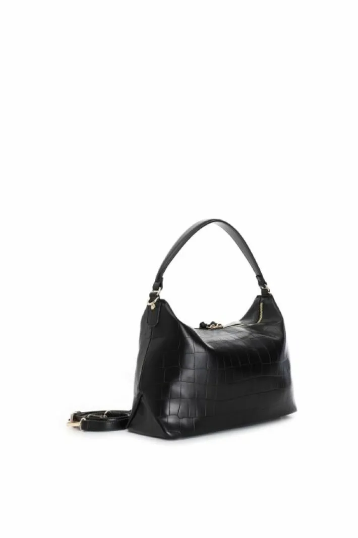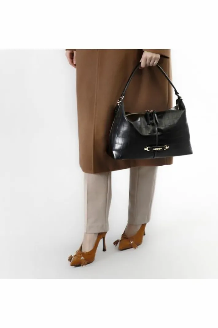 Sacca in materiale sintetico stampa cocco. applicazione di tag con lettering in metallo. chiusura con cerniera. tasca interna con zip. tracolla removibile.