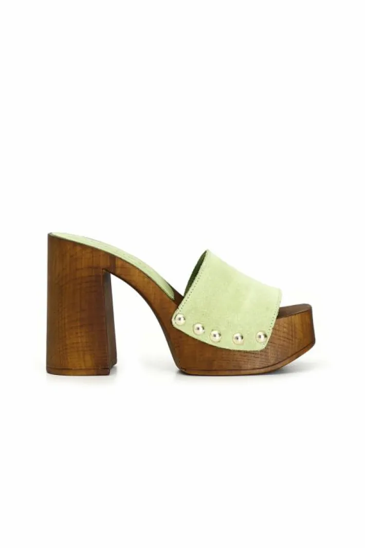 Zoccoli con fascia in crosta disponibile in 6 colori. plateau e tacco in legno scuro e sottopiede in suede che riprende il colore della fascia.