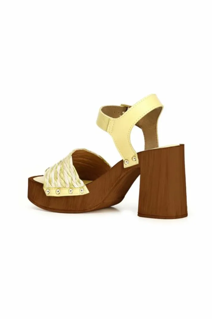 Zoccoli con tacco in legno e fascia decorativa in rafia intrecciata bicolore.