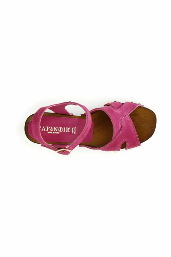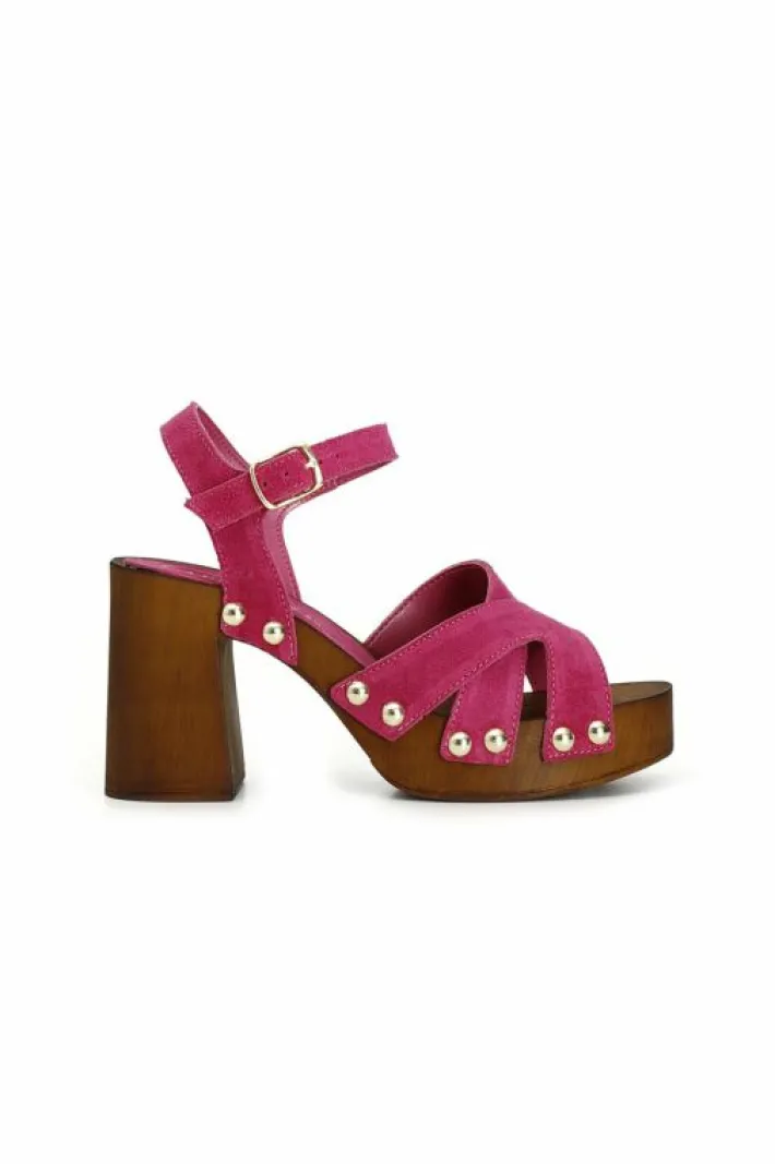 Zoccoli con tacco alto in legno e plateau. intreccio in suede e cinturino alla caviglia