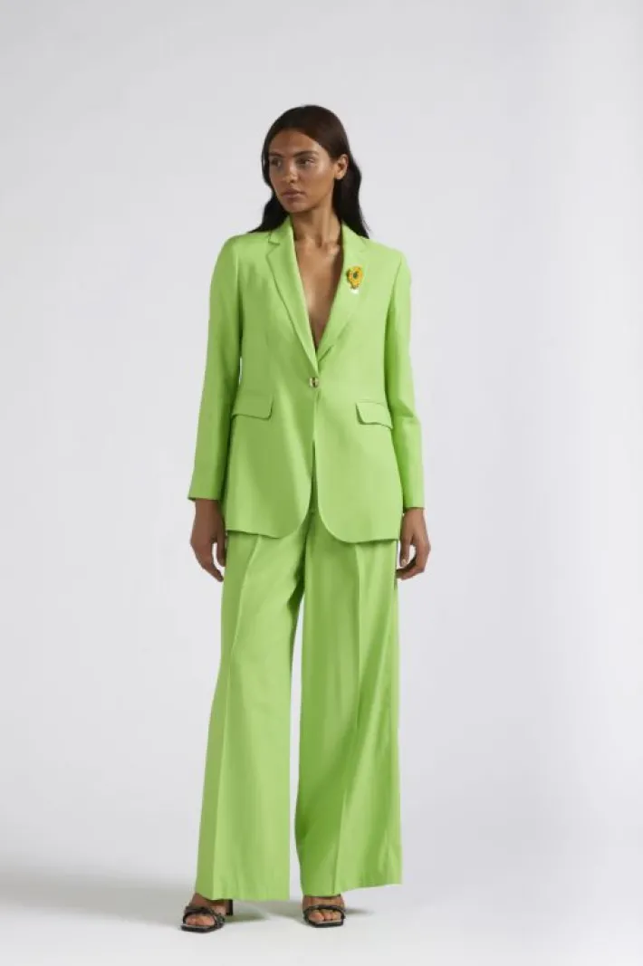 Blazer monopetto in tessuto misto viscosa e con bottone logato color oro chiaro. tasche a filetto con pattina. il colletto è arricchito da un accessorio removibile a fiore lavorato a crochet